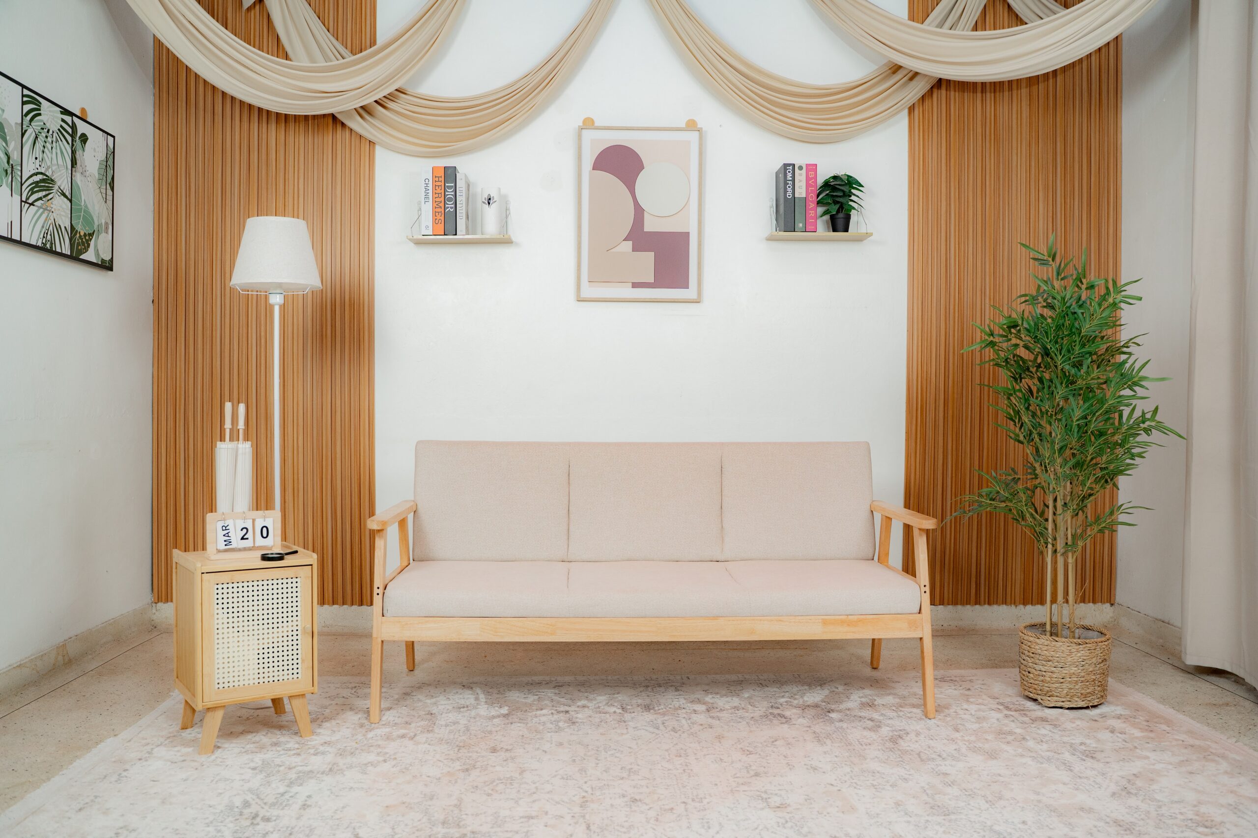Vibe eksotik dengan elemen rotan, permaidani geometri, dan dinding arch yang hangat. Warna kuning krim yang vibrant menaikkan seri wajah.
