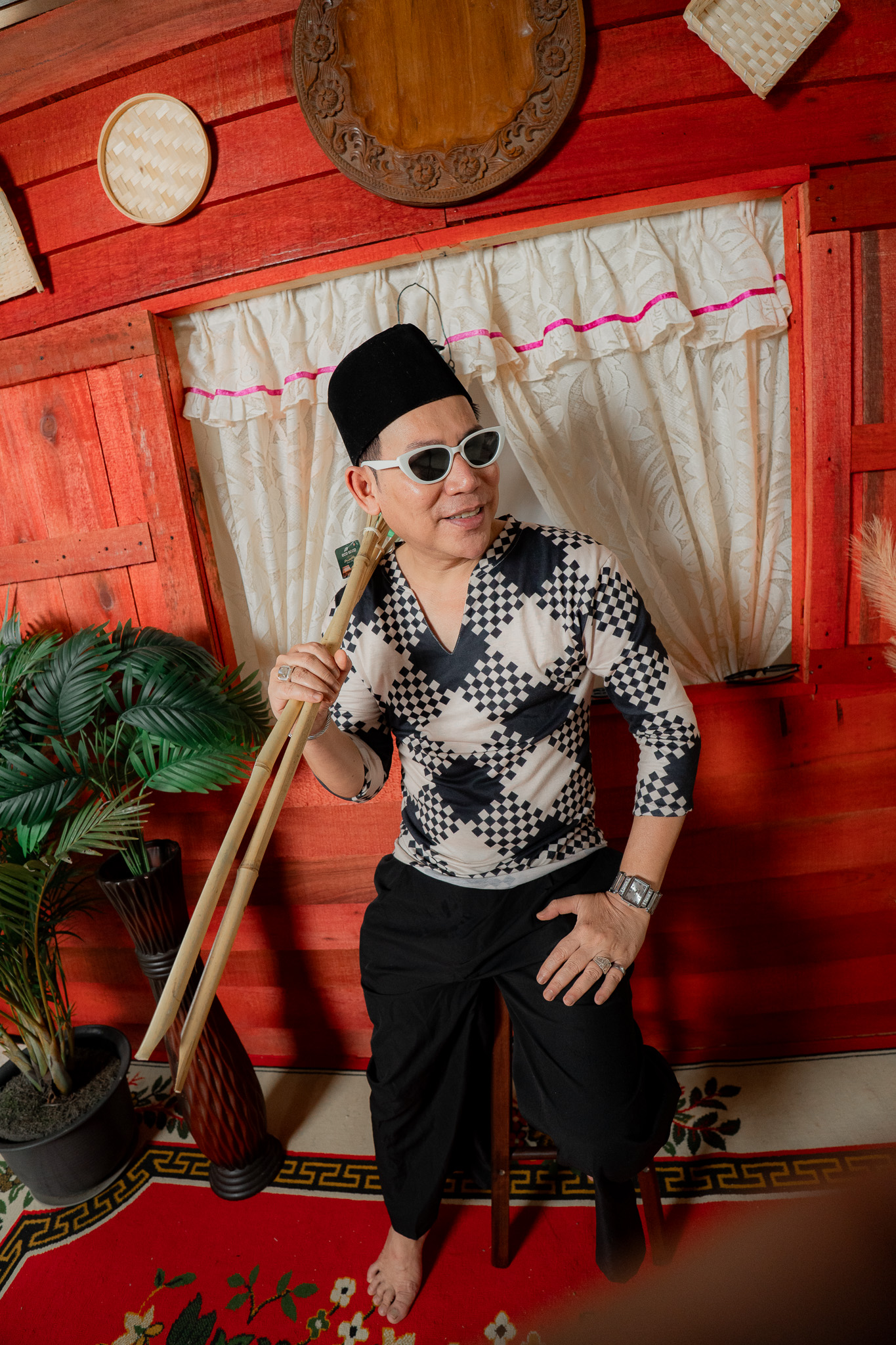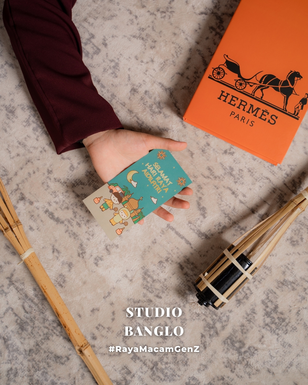 Mengembalikan nostalgia rindu suasana pagi raya di kampung halaman. Menampilkan dinding papan kayu rona kemerahan klasik, langsir renda vintage, dan dekorasi anyaman tradisional.